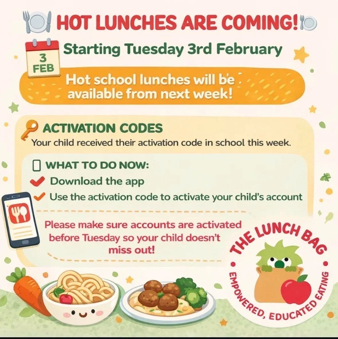 We are delighted to inform you that the school hot meals programme is scheduled to begin on Tuesday 3rd February.